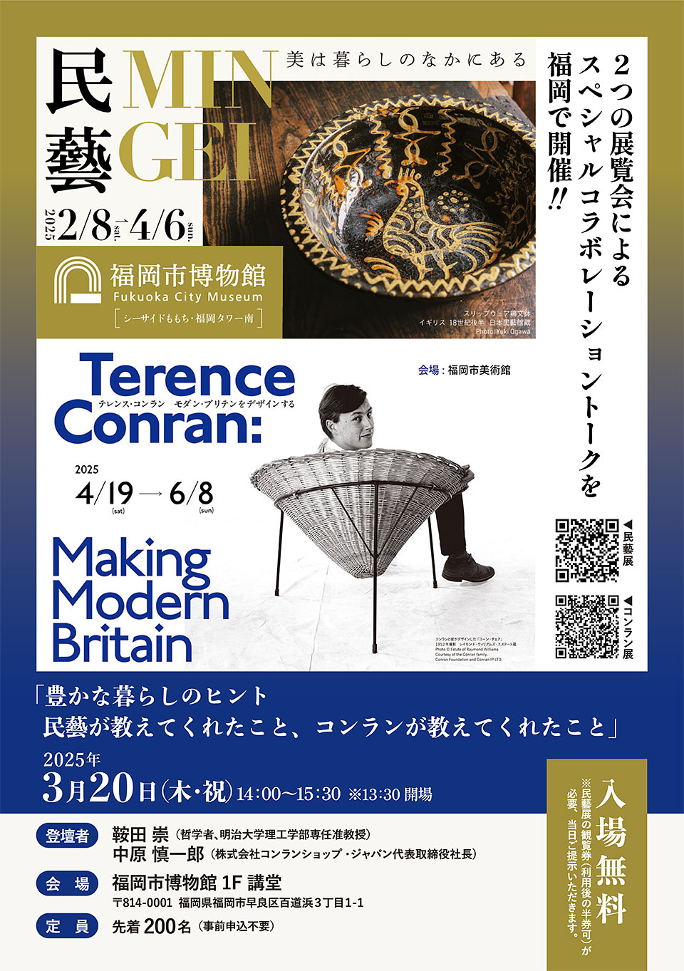 本展と『民藝 MINGEI―美は暮らしのなかにある』(福岡市博物館で4/6まで開催)、2つの展覧会によるスペシャルコラボレーショントークを開催。