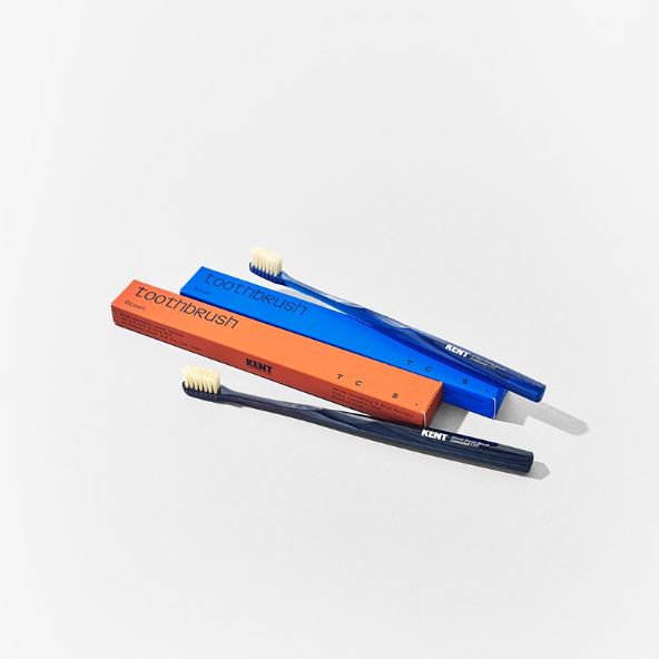 白馬毛の歯ブラシは、歯ぐきのマッサージに適しておりホワイトニング効果も期待できます。 表面にはKENTのブランドロゴ、裏面にTCS.のオリジナルロゴ入り。