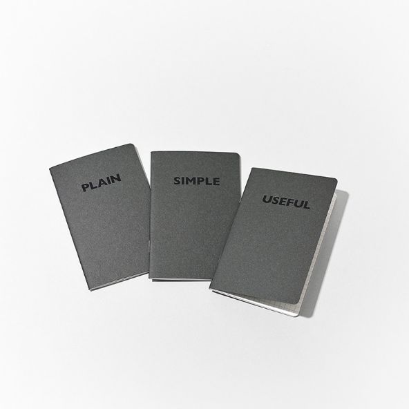 哲学「PLAIN」「SIMPLE」「USEFUL」をそれぞれ表紙のタイトルにしたポケット型ノート。中のノートはタイトルに併せて異なります(無地・横罫・方眼)。