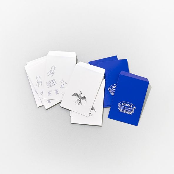 ポチ袋5枚セット。テレンス・コンランがデザインしたテーブルウェアシリーズ「BALLOONWARE」製品の裏側に印字されているロゴ、書籍「MY LIFE IN DESIGN」の中のイラスト、テレンス・コンランの名刺にデザインされていた鳥をそれぞれデザイン。