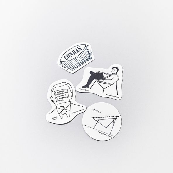テレンス・コンランがデザインした家具のスケッチやロゴ、SAYURI NISHIKUBO氏による手書きアートのステッカー。